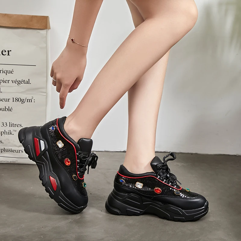 Special Offer ADBOOV Модные женские кроссовки с блестками и драгоценными камнями; ботинки с массивным каблуком из синтетической кожи; женские кроссовки; Sapato... Discount 40% Today!