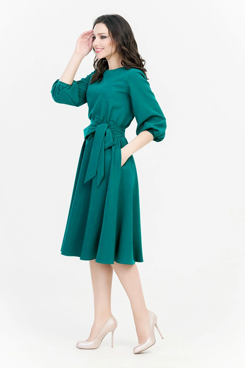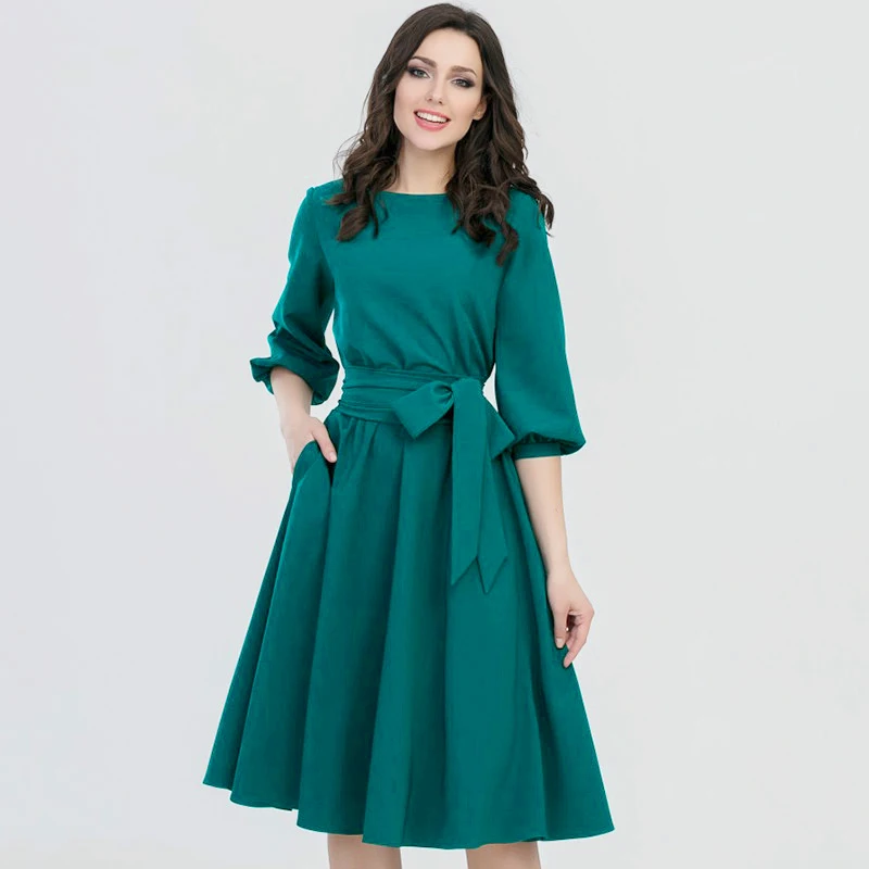 (0% Off) Купить Ретро прочный фонарь рукав А силуэт юбка женская элегантная O образным вырезом половина карман пояс длина до колена Повседневное плат... Продажа Дешево