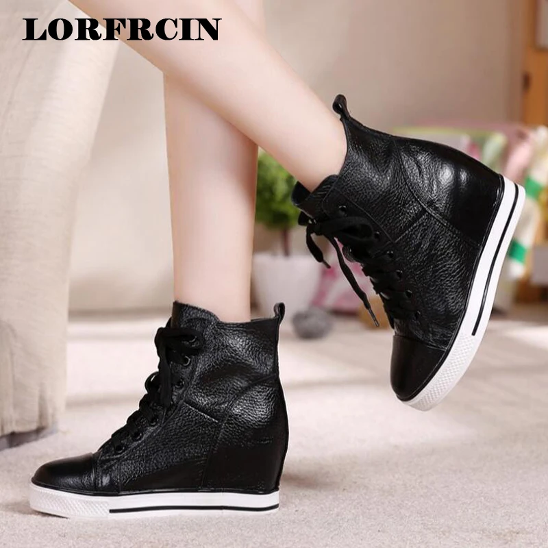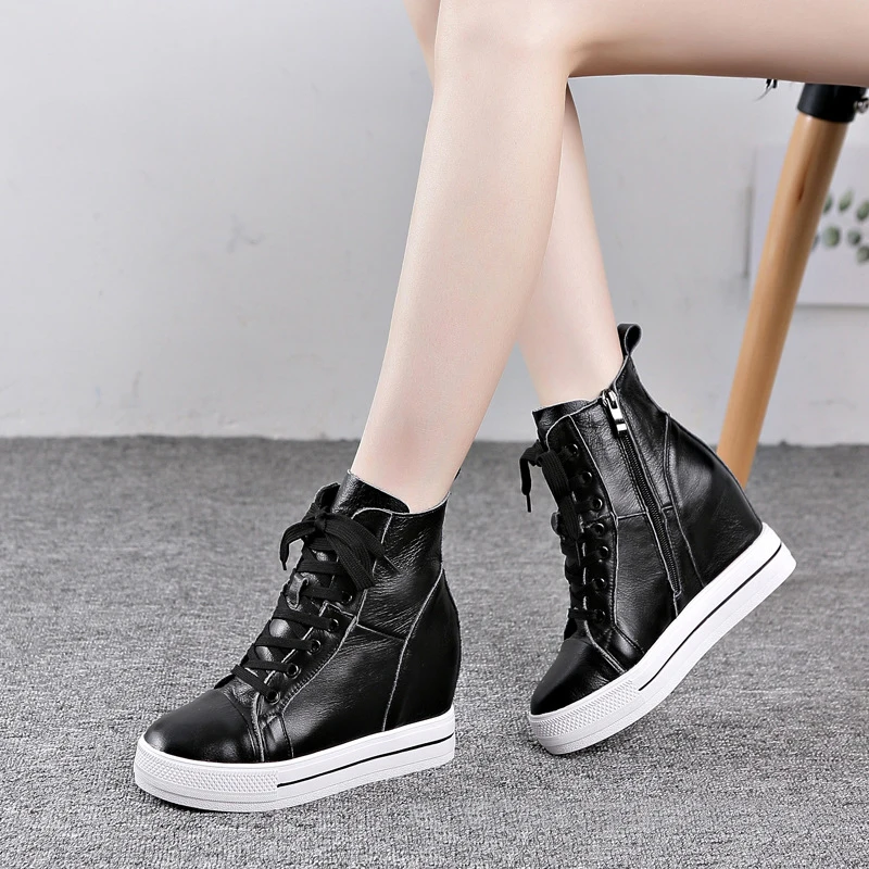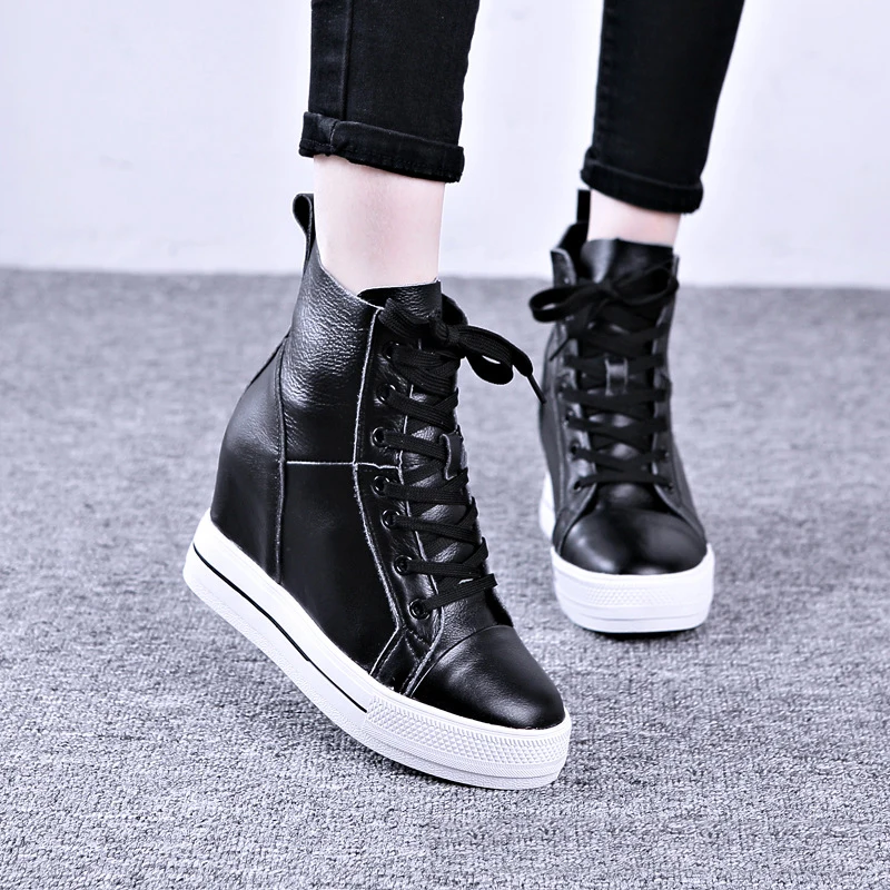 (0% Off) Купить Женские ботинки из натуральной кожи; ботильоны на платформе, визуально увеличивающие рост; кроссовки высокой танкетке; Повседневная обу... Цена Дешево