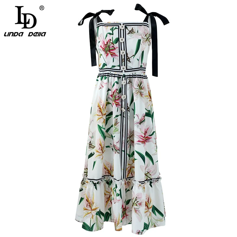 (22% Off) Купить LD Linda Della взлетно посадочной полосы моды летнее платье Для женщин лук на бретельках с цветочным принтом и оборками Повседневное плать... Цена Дешево