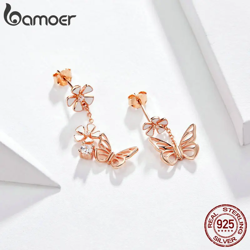 Product Name: BAMOER серьги в виде бабочек и цветов, S925, эмаль, цветочные Асимметричные Висячие серьги, Стерлинговое Серебро 925 пробы, ювелирные изделия для п...