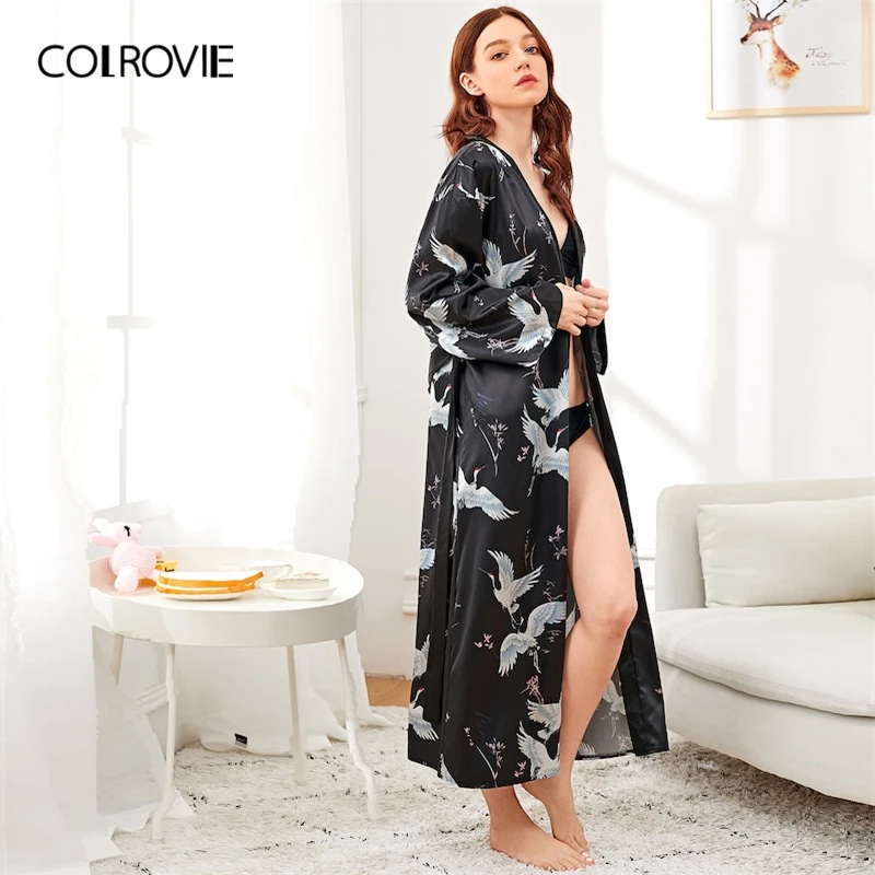(42% Off) Купить Женское атласное длинное платье COLROVIE, черное однотонное с принтом журавлей, Весенняя Корейская Пижама поясом, 2019 Цена Дешево