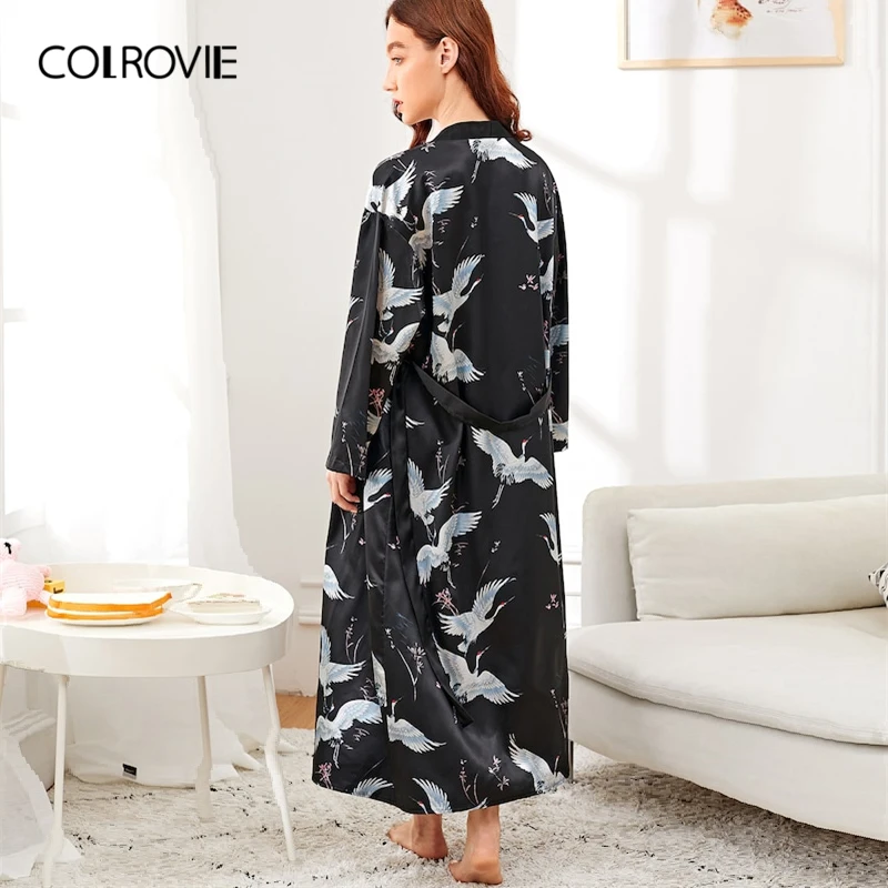 Special Offer Женское атласное длинное платье COLROVIE, черное однотонное атласное платье с принтом журавлей, Весенняя Корейская Пижама с поясом, 2019 Discount 42% Today!