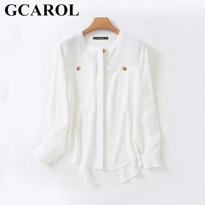 Product Name: GCAROL Новые поступления Весна Лето ассиметричная Длина блузка 2 большие карманы О образный вырез большие OL элегантная рубашка белые базовые Т...