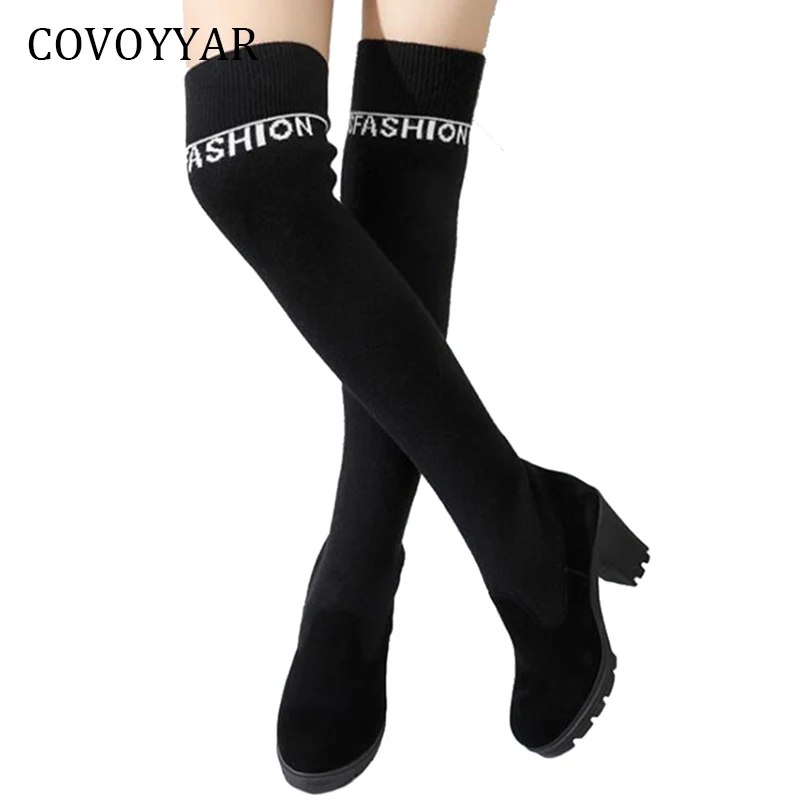 (45% Off) Купить Женские сапоги выше колена Covoyar, черные облегающие высокие на высоком каблуке, осень и зиму, WBS773, 2019 Продажа Дешево