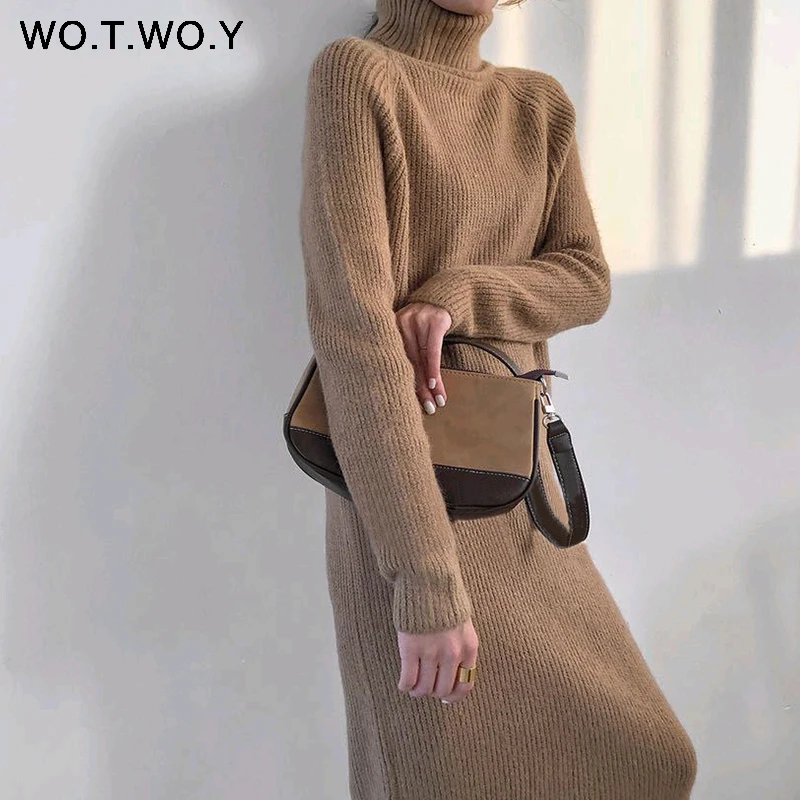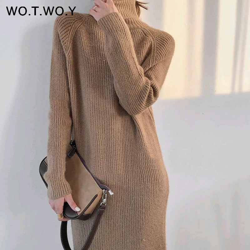 Product Name: WOTWOY осенне зимнее хлопковое женское платье 2020 с высоким воротом и длинным рукавом реглан до середины икры вязаное плотное женское платье те...
