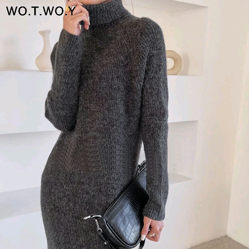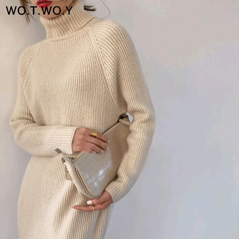Special Offer WOTWOY осенне зимнее хлопковое женское платье 2020 с высоким воротом и длинным рукавом реглан до середины икры вязаное плотное женское платье те... Discount 50% Today!