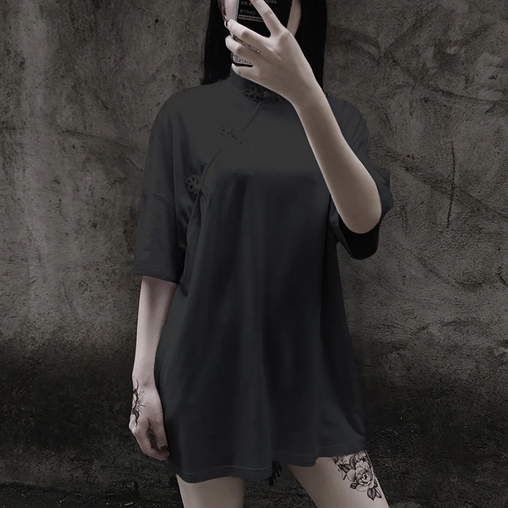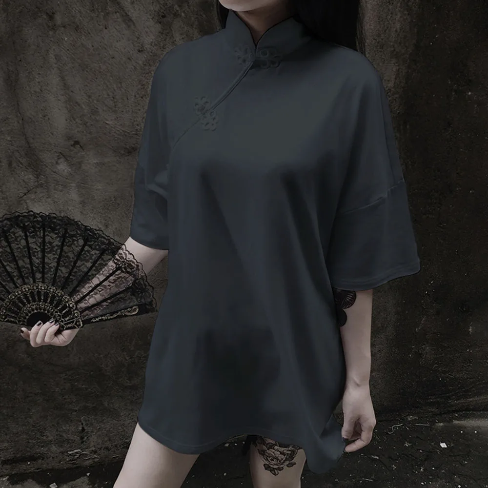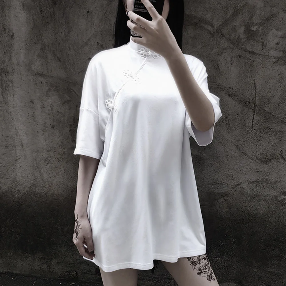 Special Offer Женский Чонсам в китайском стиле, длинная рубашка на пуговицах, короткий рукав, уличная одежда, сексуальный винтажный Harajuku Свободный Белый ... Discount 51% Today!