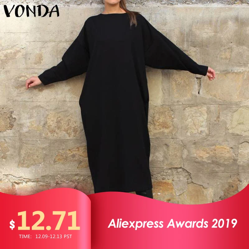 (42% Off) Купить Платье рубашка с длинным рукавом VONDA, женское повседневное одноцветное длинное платье, модное платье круглым вырезом, Vestidos размера плюс, б... Цена Дешево