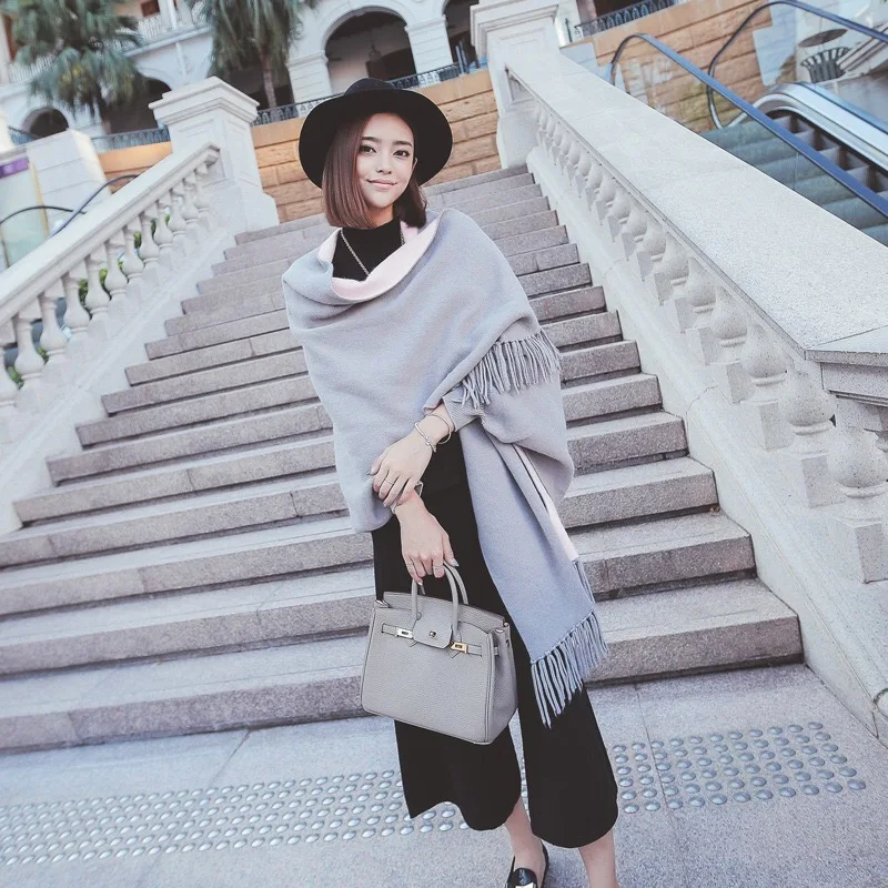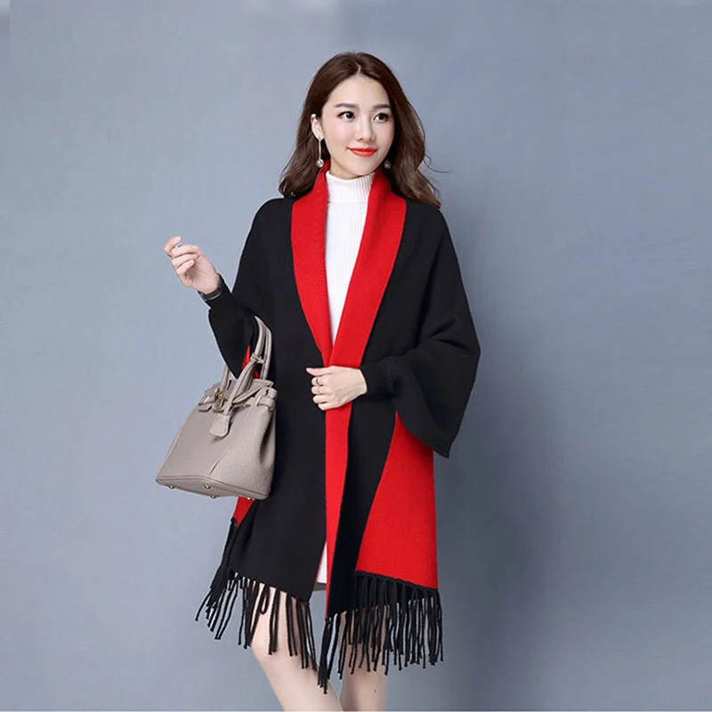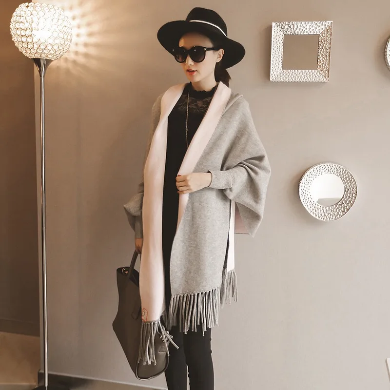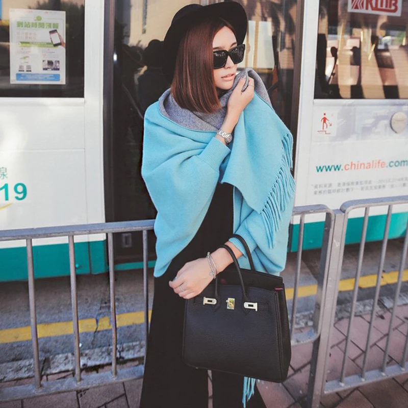(7% Off) Купить Mingjiebihuo Новое кашемировое пончо, шаль с рукавами, Женская осенне зимняя плотная теплая Двусторонняя однотонная накидка кисточками для дев... Продажа Дешево