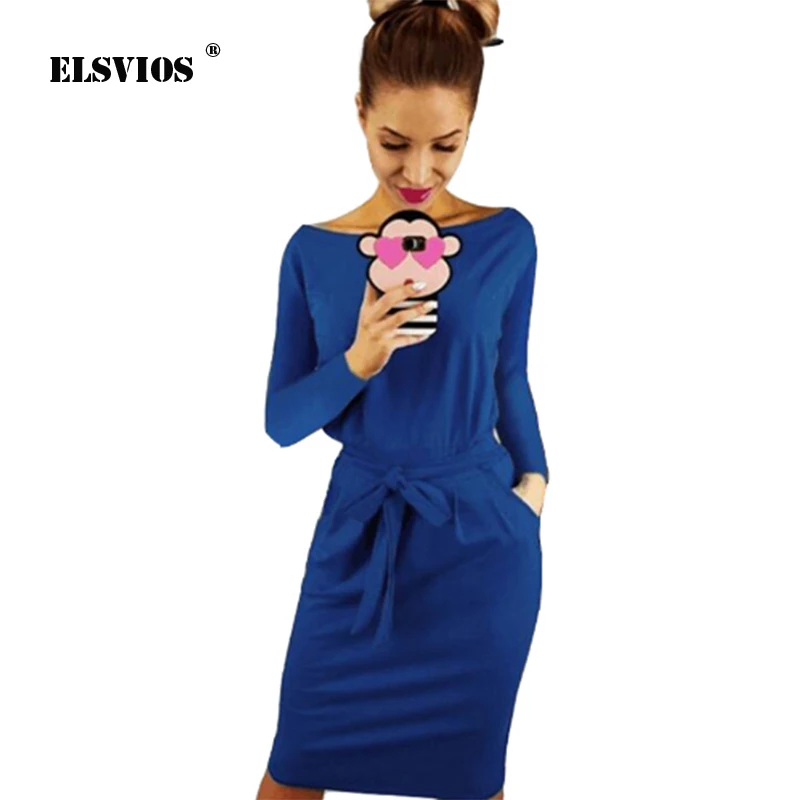 Special Offer Женское пляжное платье ELSVIOS, повседневное однотонное платье до колена с круглым вырезом и длинными рукавами и поясом, лето 2018 Discount 0% Today!