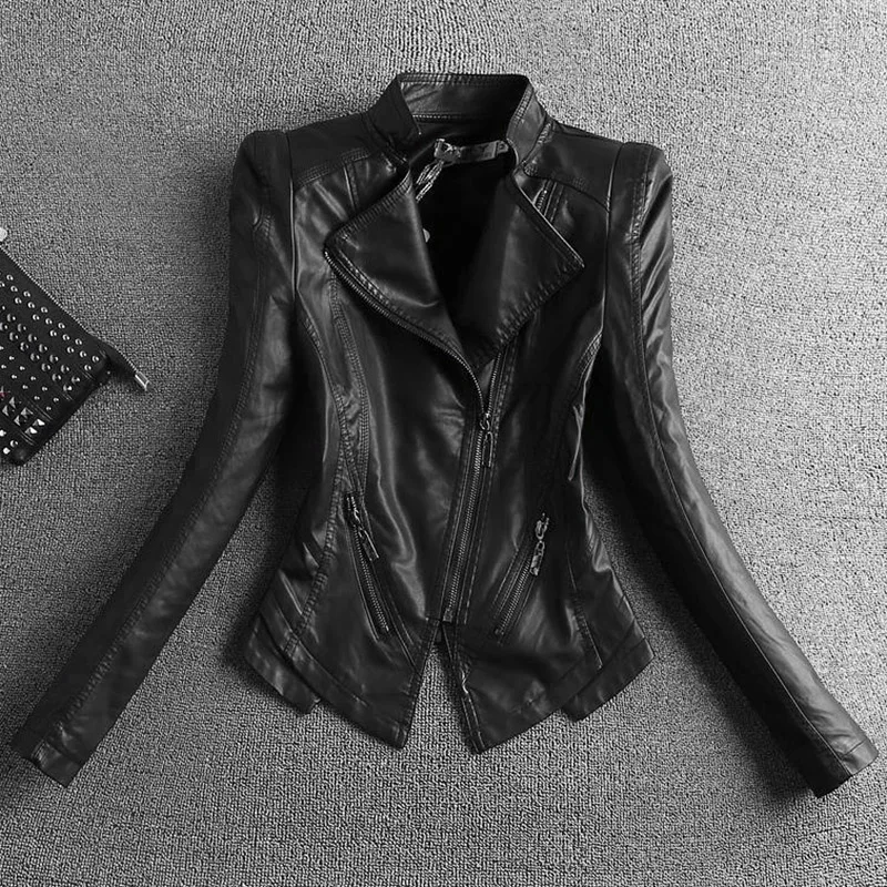 (25% Off) Купить НОВАЯ тонкая кожаная куртка с воротником, Женская Короткая куртка, женская черная мотоциклетная на весну и осень Цена Дешево