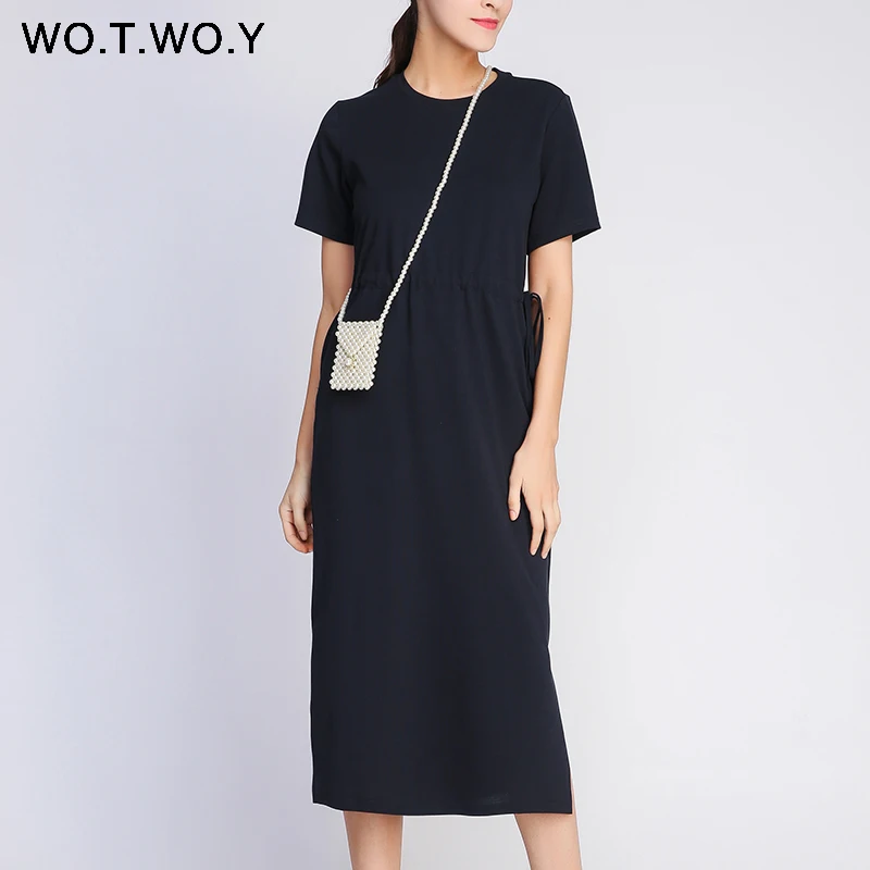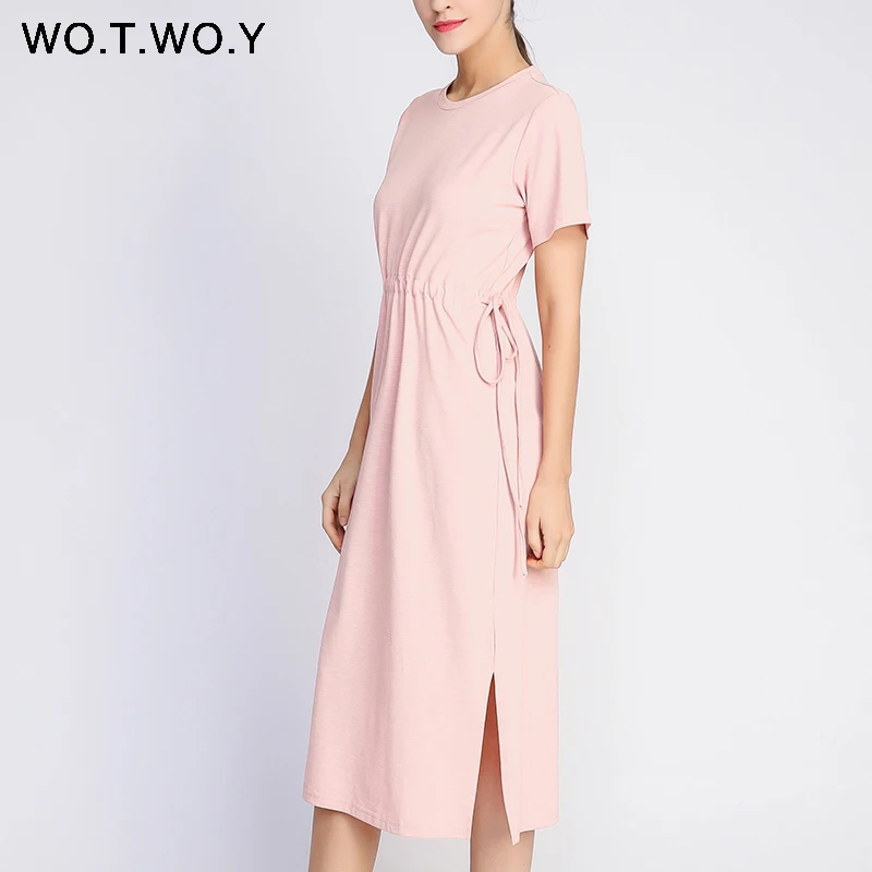 Special Offer Женское длинное платье футболка с поясом WOTWOY, повседневное свободное платье до щиколотки с О образным вырезом и коротким рукавом, розовое х... Discount 26% Today!