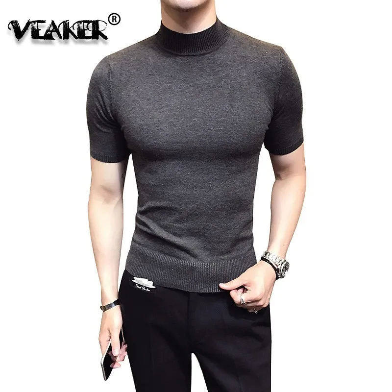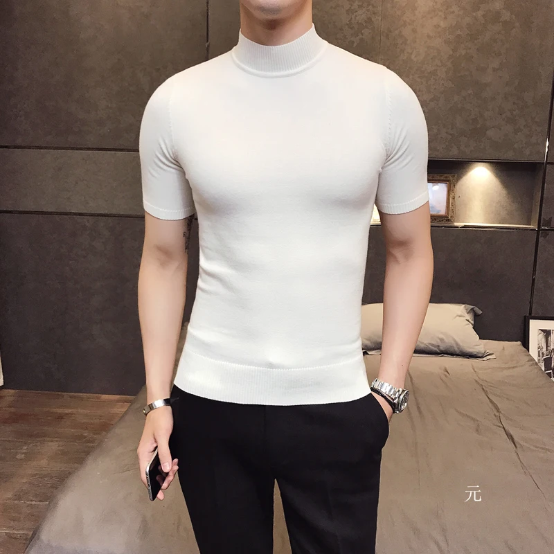 (50% Off) Купить Новая летняя мужская футболка, трикотажный топ с короткими рукавами, мужской Однотонный свитер половинным высоким воротником, пуловер, фу... Продажа Дешево