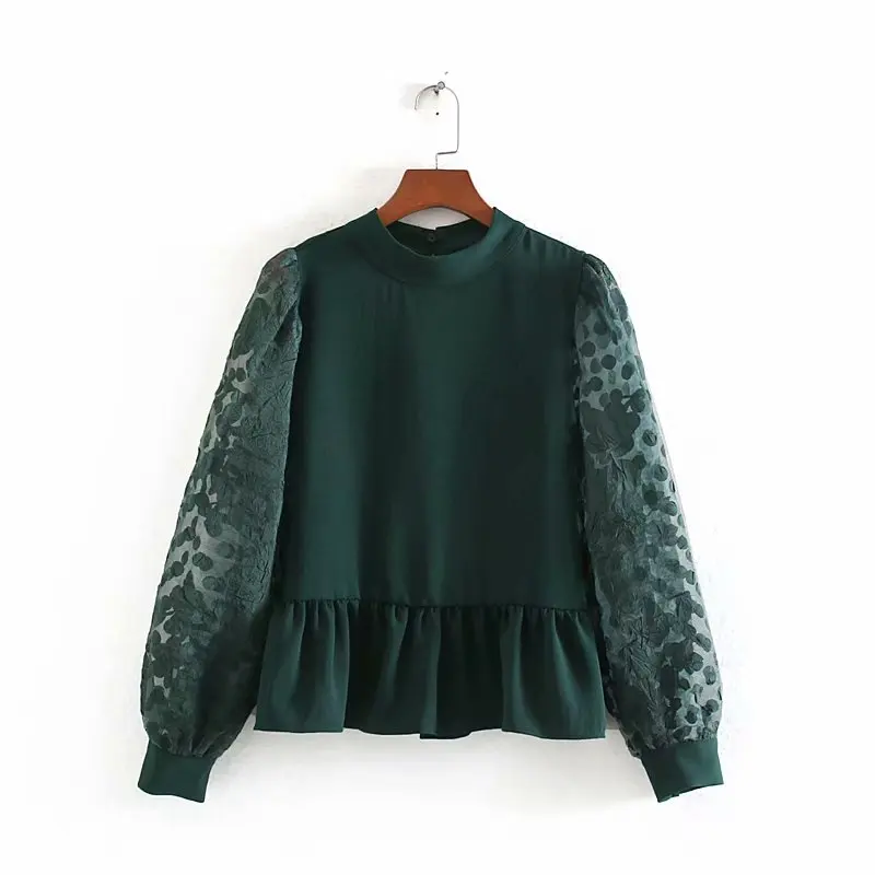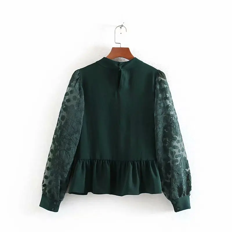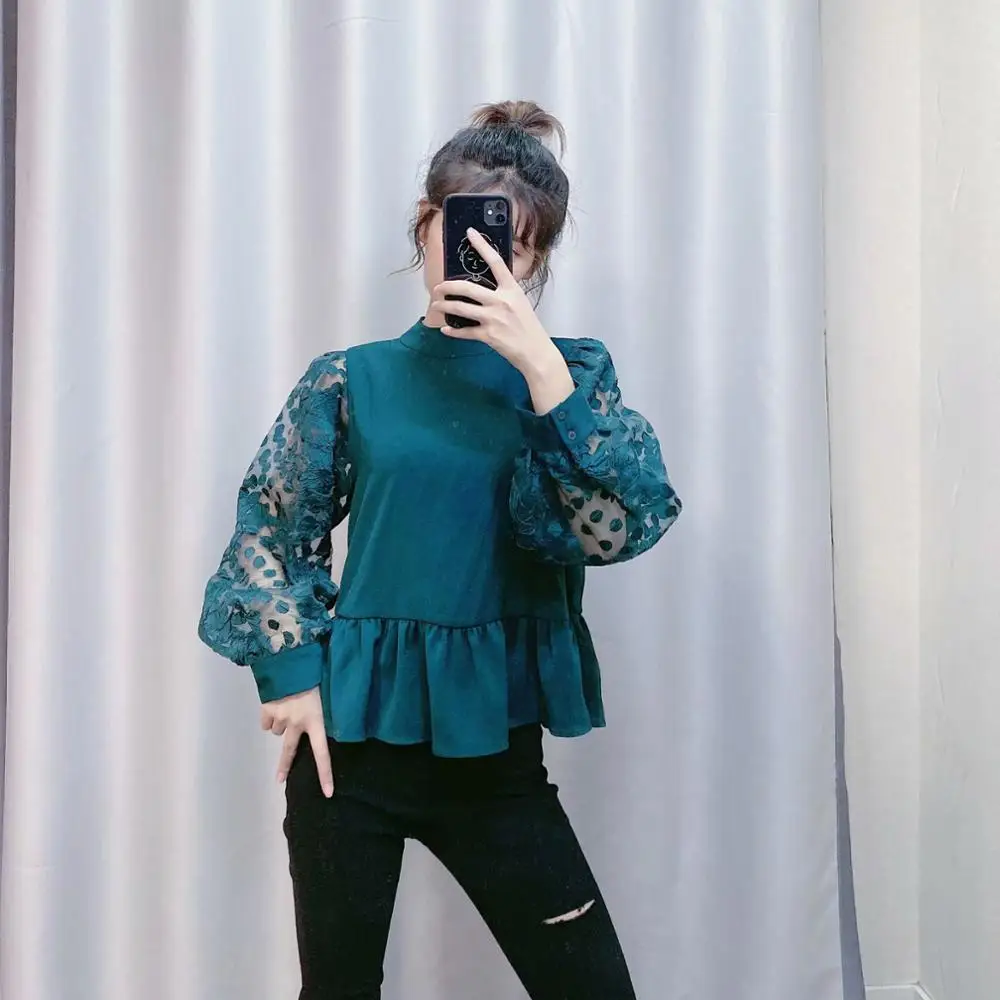 Product Name: Женские модные повседневные шифоновые блузки с прозрачным рукавом в стиле пэчворк, женские рубашки со стоячим воротником и оборками, шикар...