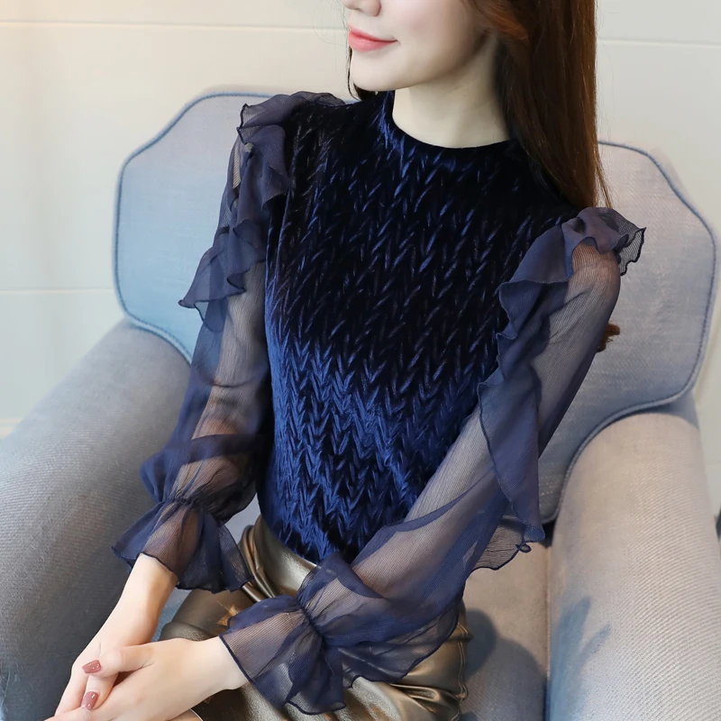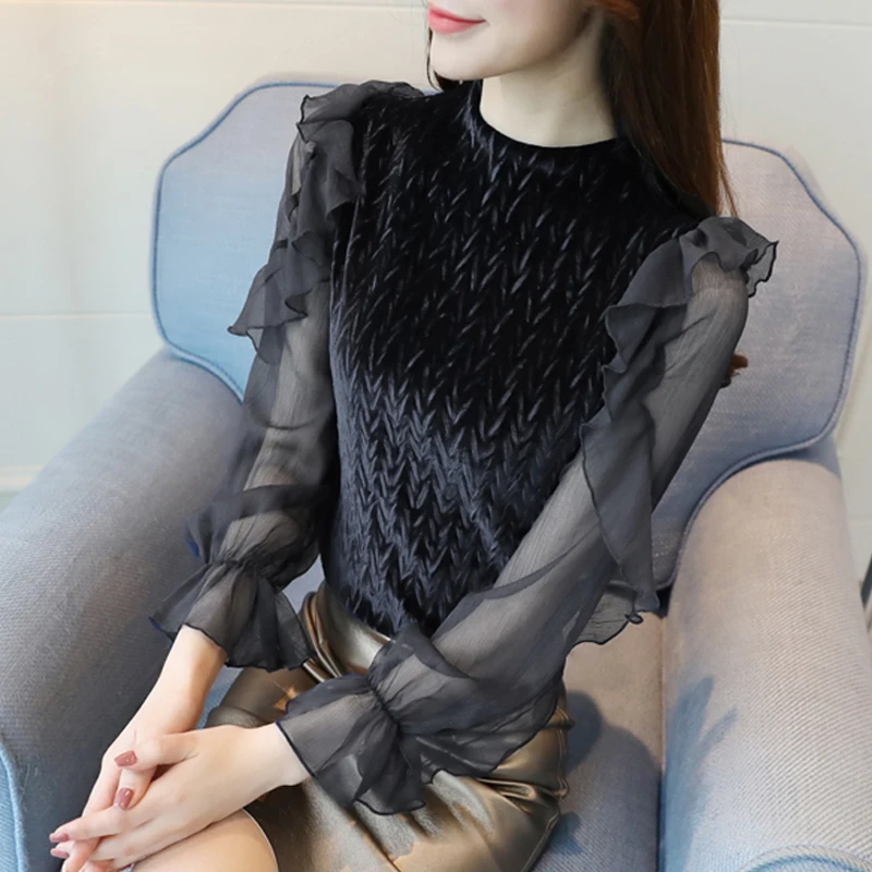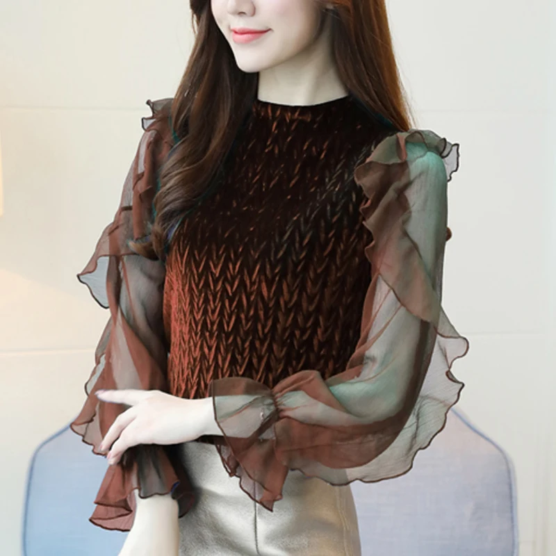 Special Offer элегантный прозрачный длинный рукав женские Топы повседневные Женские блузки с многослойными оборками велюровые блузки рубашка с расклеш... Discount 42% Today!