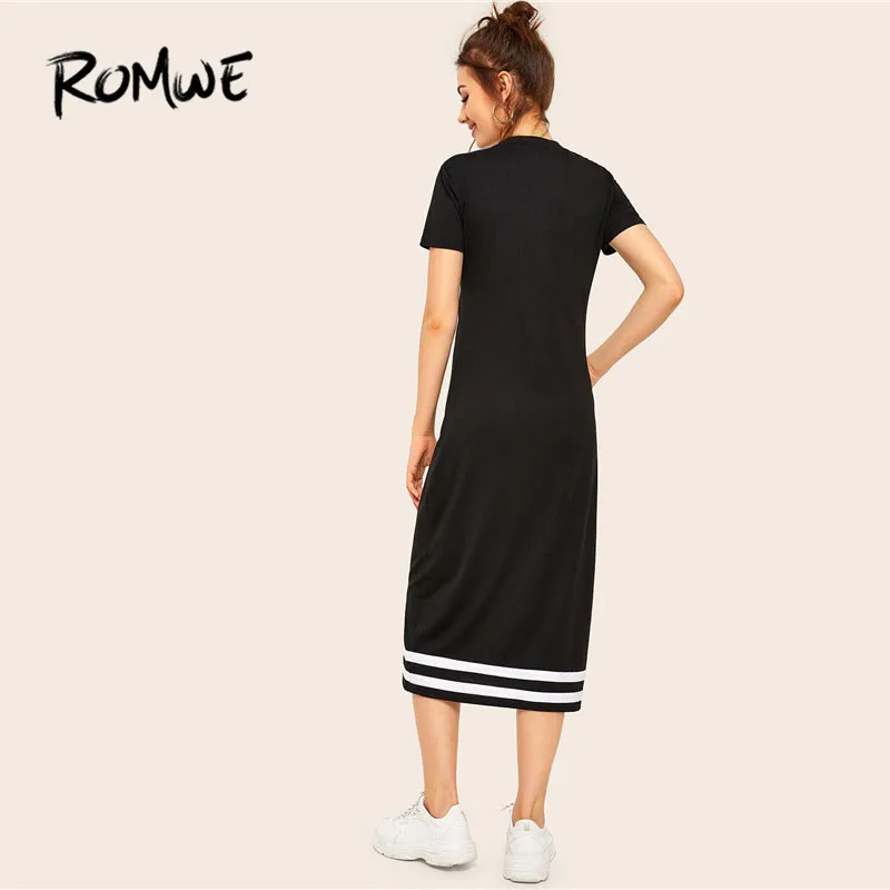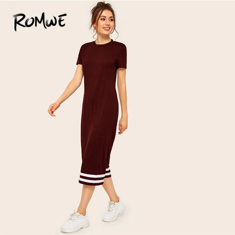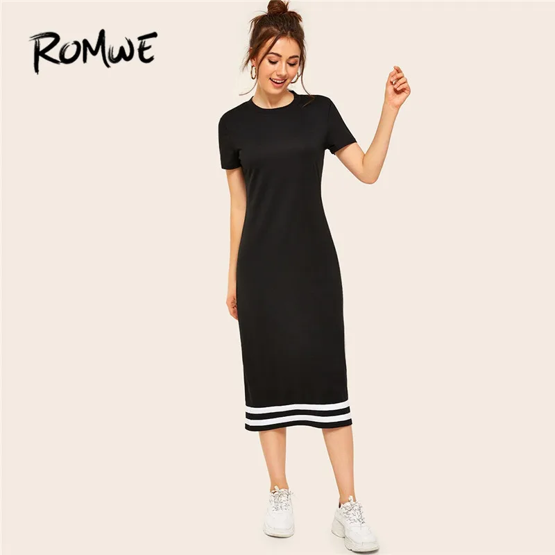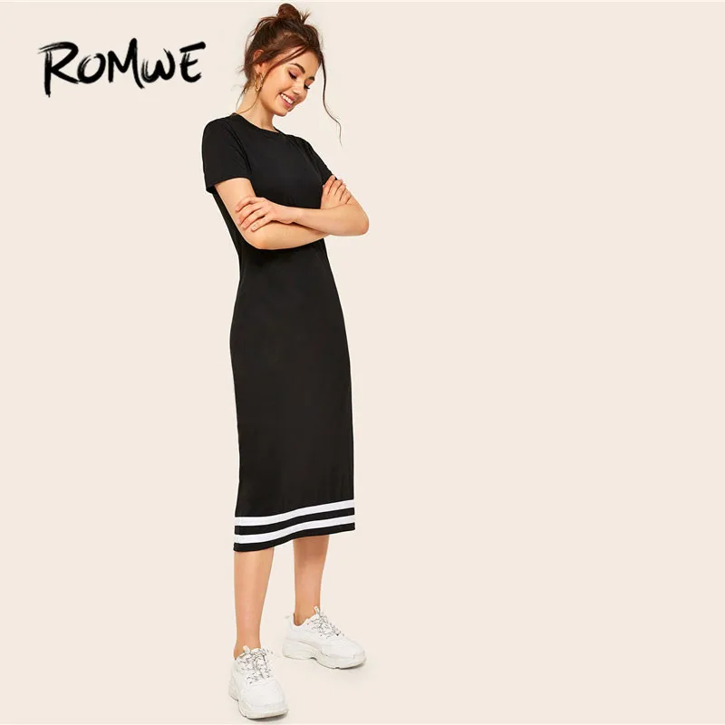 Special Offer ROMWE Футболка с контрастным полосатым подолом, женское Летнее спортивное Повседневное платье с коротким рукавом, женские минималистичные дл... Discount 48% Today!
