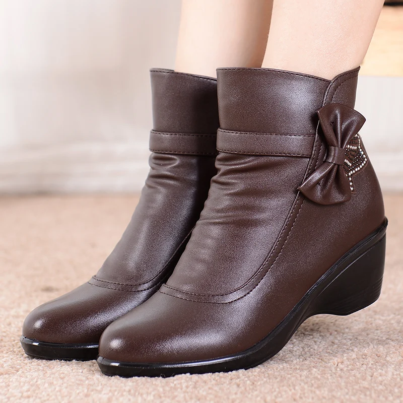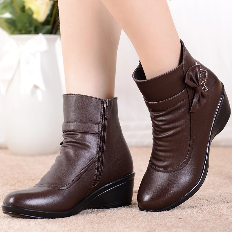 Product Name: Женская зимняя обувь; зимние ботинки с бантиком; женские водонепроницаемые плюшевые ботильоны на танкетке; кожаные ботинки на молнии; botines ...
