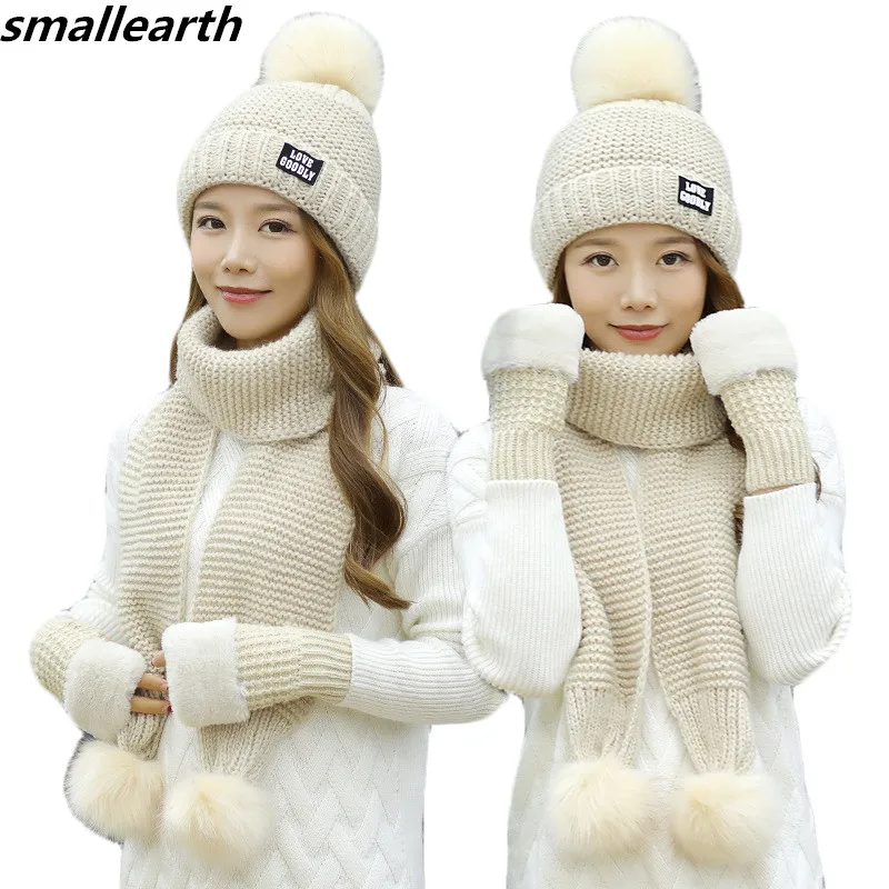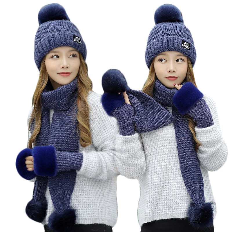 (20% Off) Купить Модная женская зимняя шапка, шарф, наборы перчаток для девочек, теплая Толстая шапка и перчатки, набор из трех предметов, однотонные вязаные ... Цена Дешево