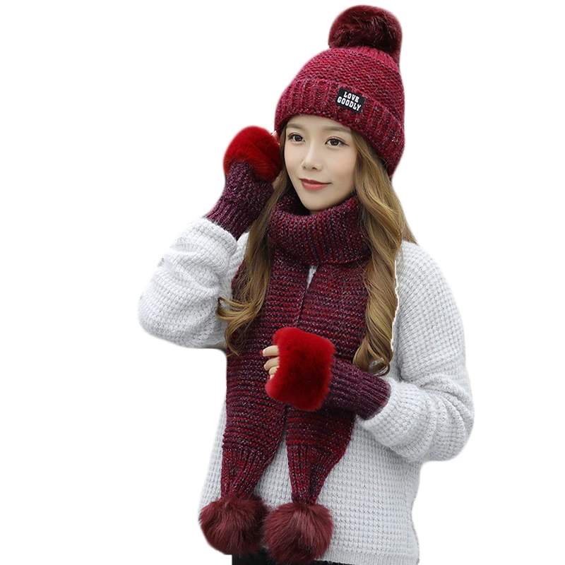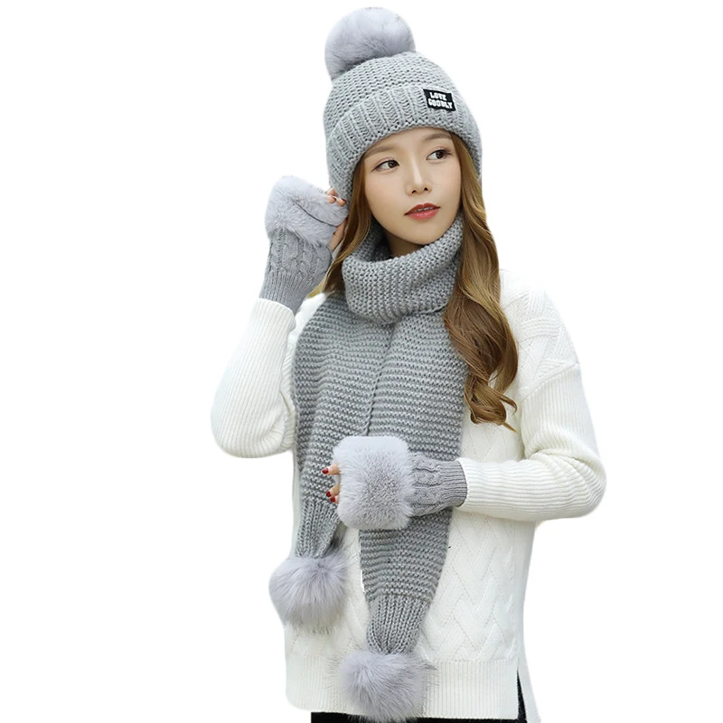 Product Name: Модная женская зимняя шапка, шарф, наборы перчаток для девочек, теплая Толстая шапка и перчатки, набор из трех предметов, однотонные вязаные ...