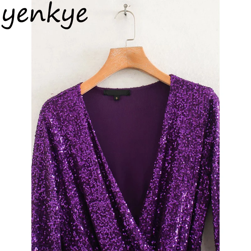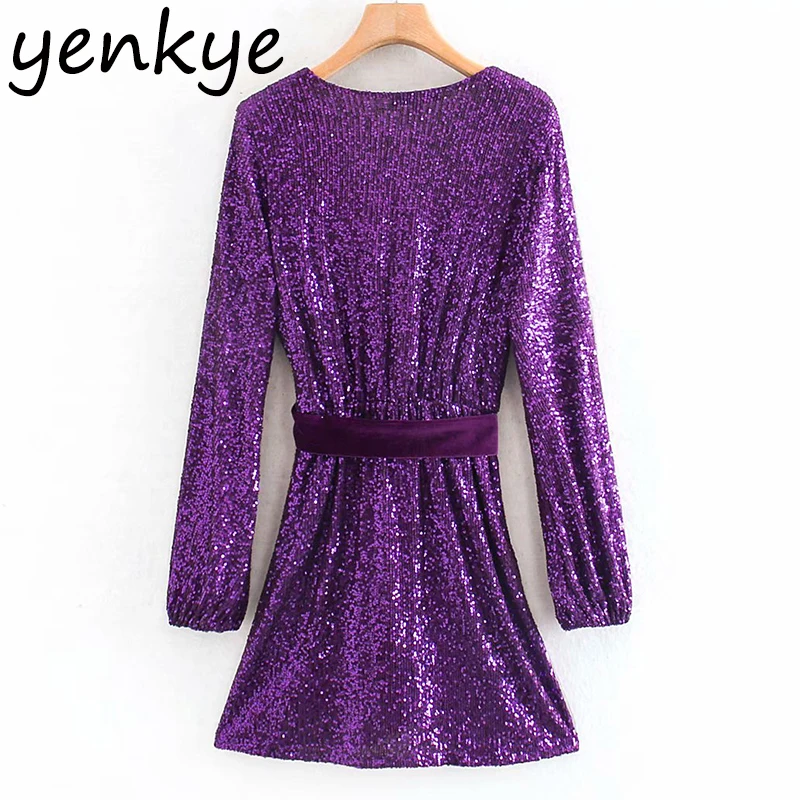 Special Offer Модное женское платье с перекрестным v образным вырезом и блестками, женское платье с длинным рукавом и поясом, Мини платье для рождественск... Discount 43% Today!