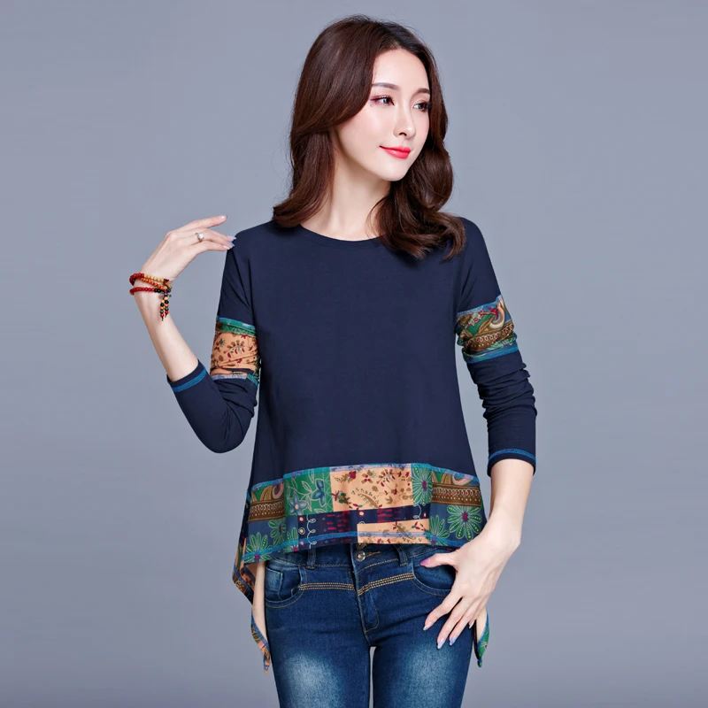 (0% Off) Купить Женские топы в этническом стиле KYQIAO, темно синяя футболка с круглым вырезом и принтом пэчворк, большие размеры, 2019 Продажа Дешево