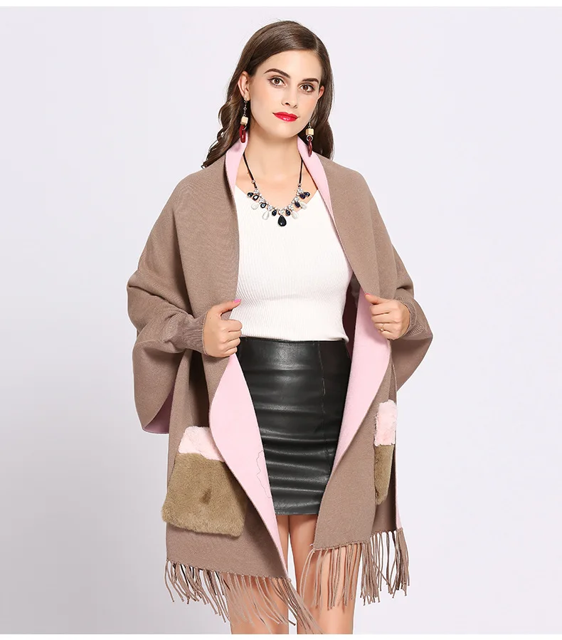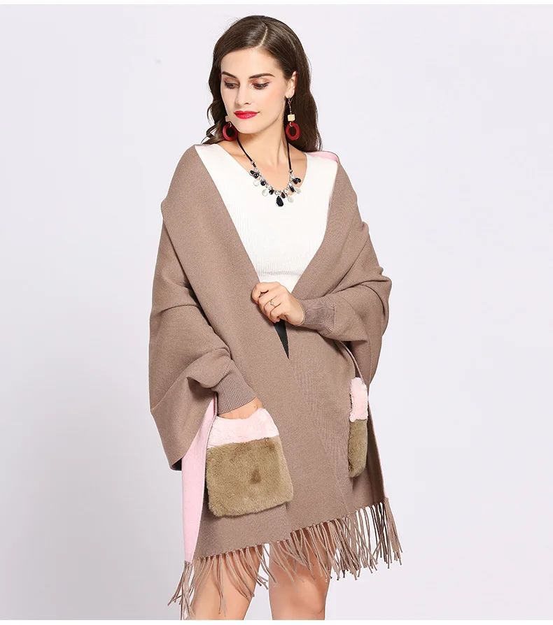 Product Name: 2018 зимнее женское пончо из искусственного кашемира с длинными рукавами, винтажная шаль с меховым карманом, Женский вязаный шарф оверсайз с ...