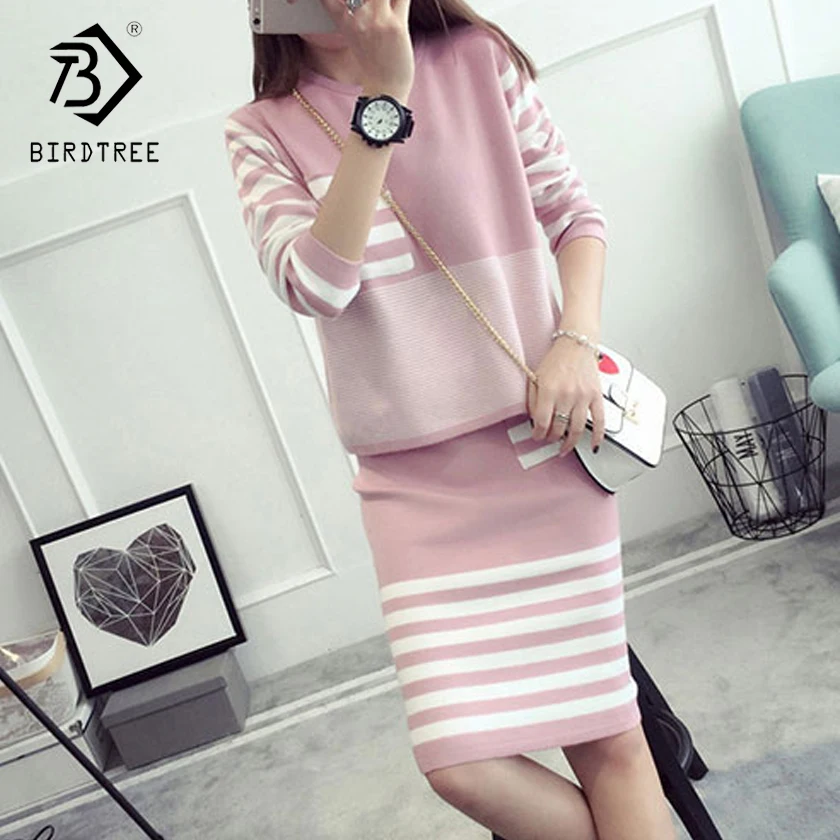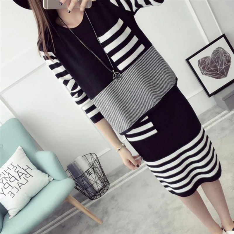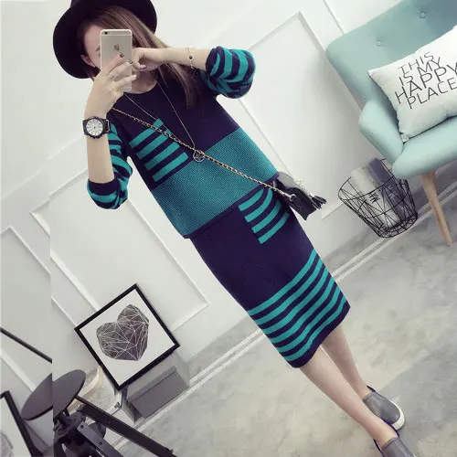 Special Offer Плюс размер 4XL новый осенний женский свитер и юбка наборы o образный вырез длинный рукав трикотажные пуловеры полосатые платья S88624LD Discount 23% Today!