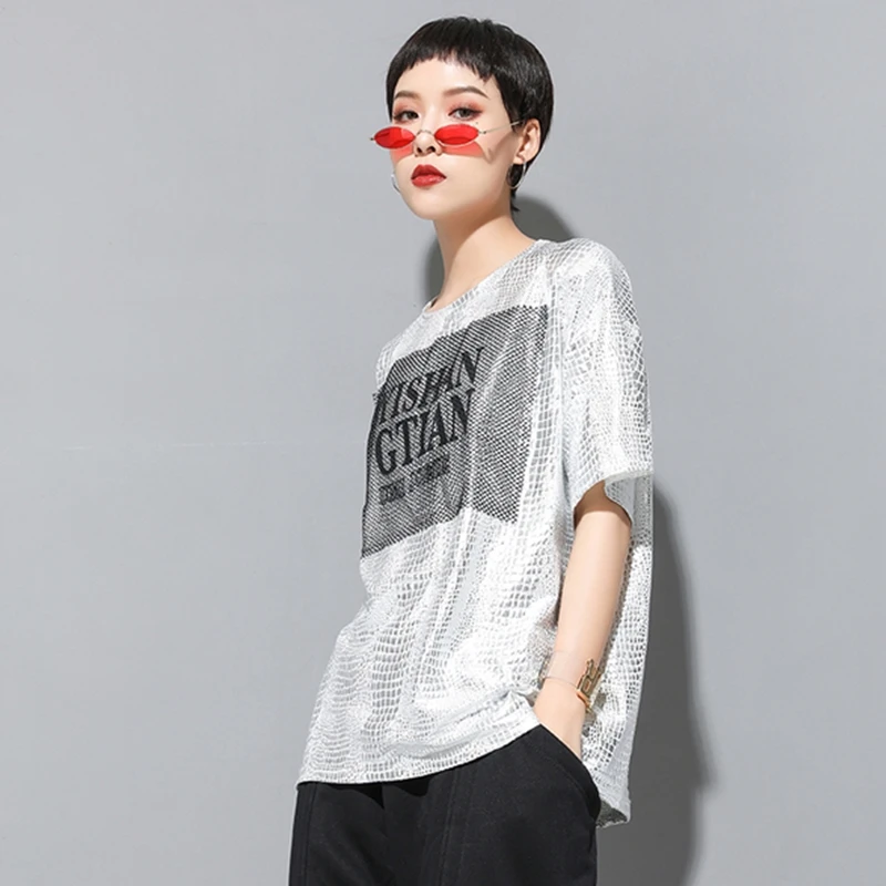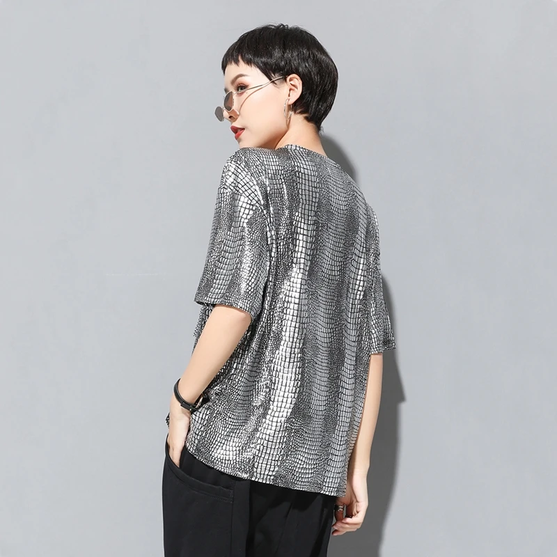 Special Offer Женская футболка с коротким рукавом, Повседневная Свободная стрейчевая футболка большого размера с серебряным принтом, уличная одежда, лет... Discount 0% Today!