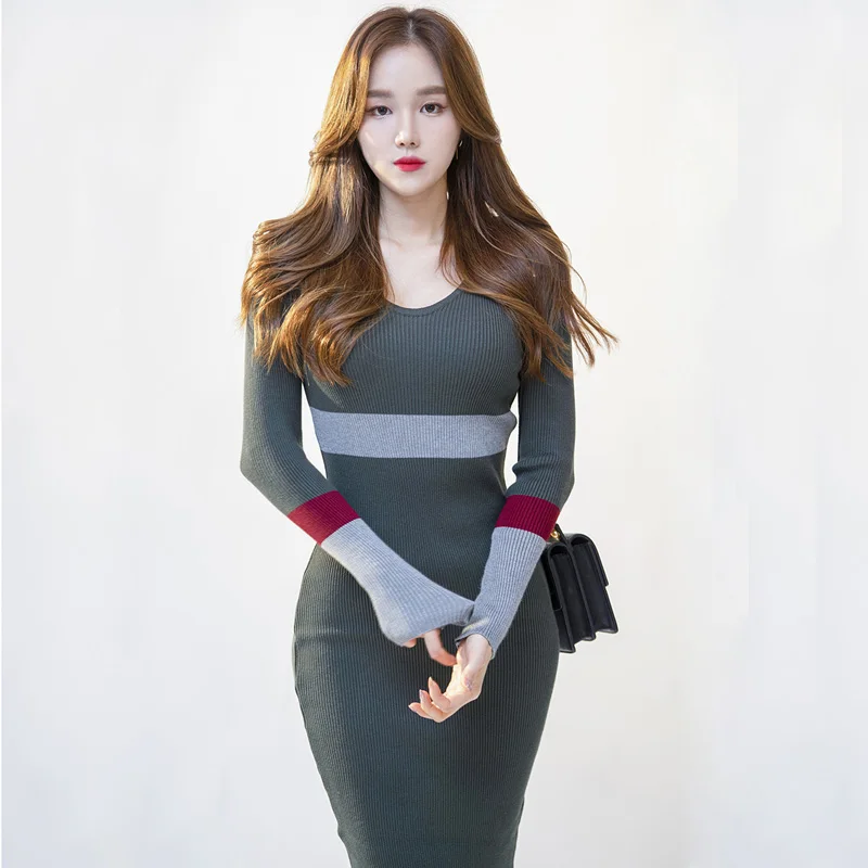 Product Name: 2019 женские зимние платья с v образным вырезом до середины икры облегающие офисные женские хлопковые платья в полоску с длинным рукавом секс...