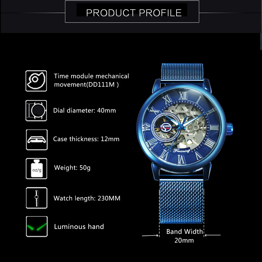 Product Name: FORSINING модные повседневные механические часы для мужчин с золотым скелетом циферблат синий сетчатый ремешок мужские часы Топ бренд Роскошны...