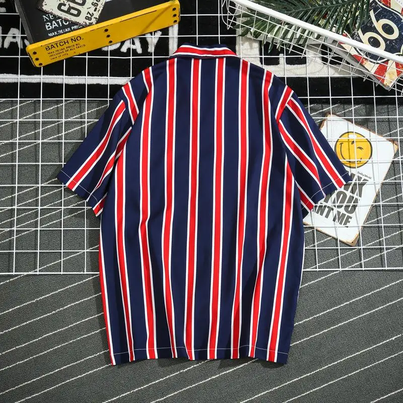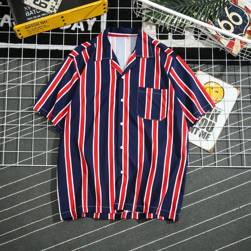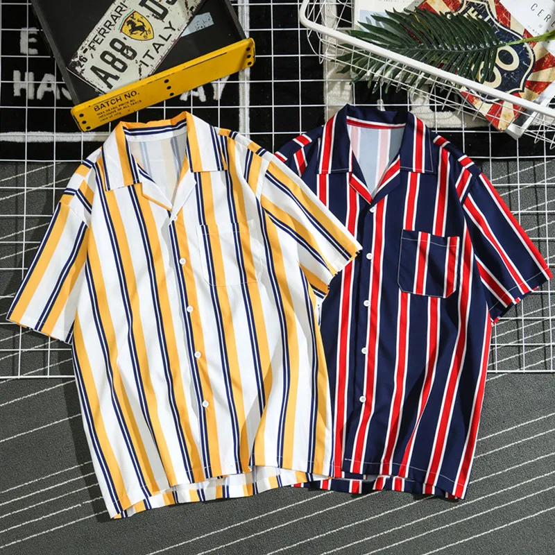 Product Name: Мужская желтая рубашка в полоску с коротким рукавом в Корейском стиле, Повседневная Свободная Гавайская пляжная тонкая рубашка, лето 2019