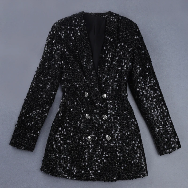 (15% Off) Купить Высококачественный новейший модный дизайнерский Блейзер 2020, женский двубортный блейзер с отложным воротником и блестками, Длинный блейзер... Цена Дешево