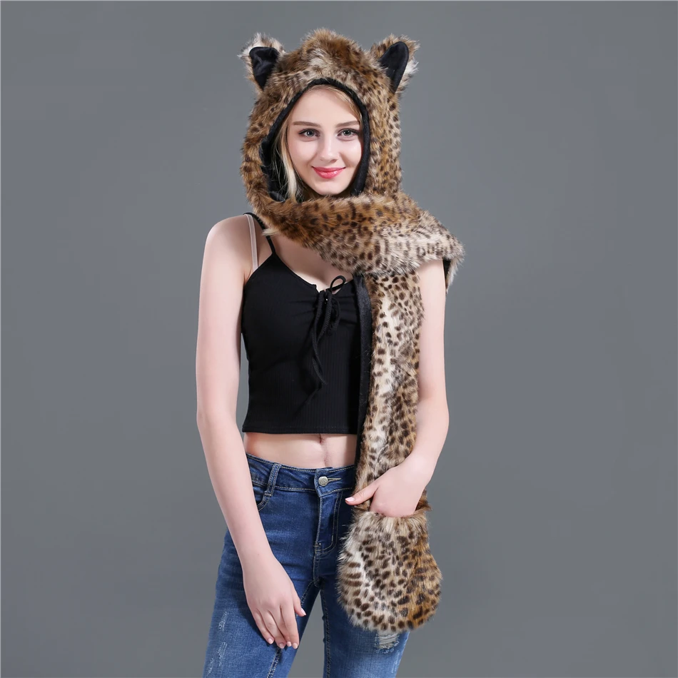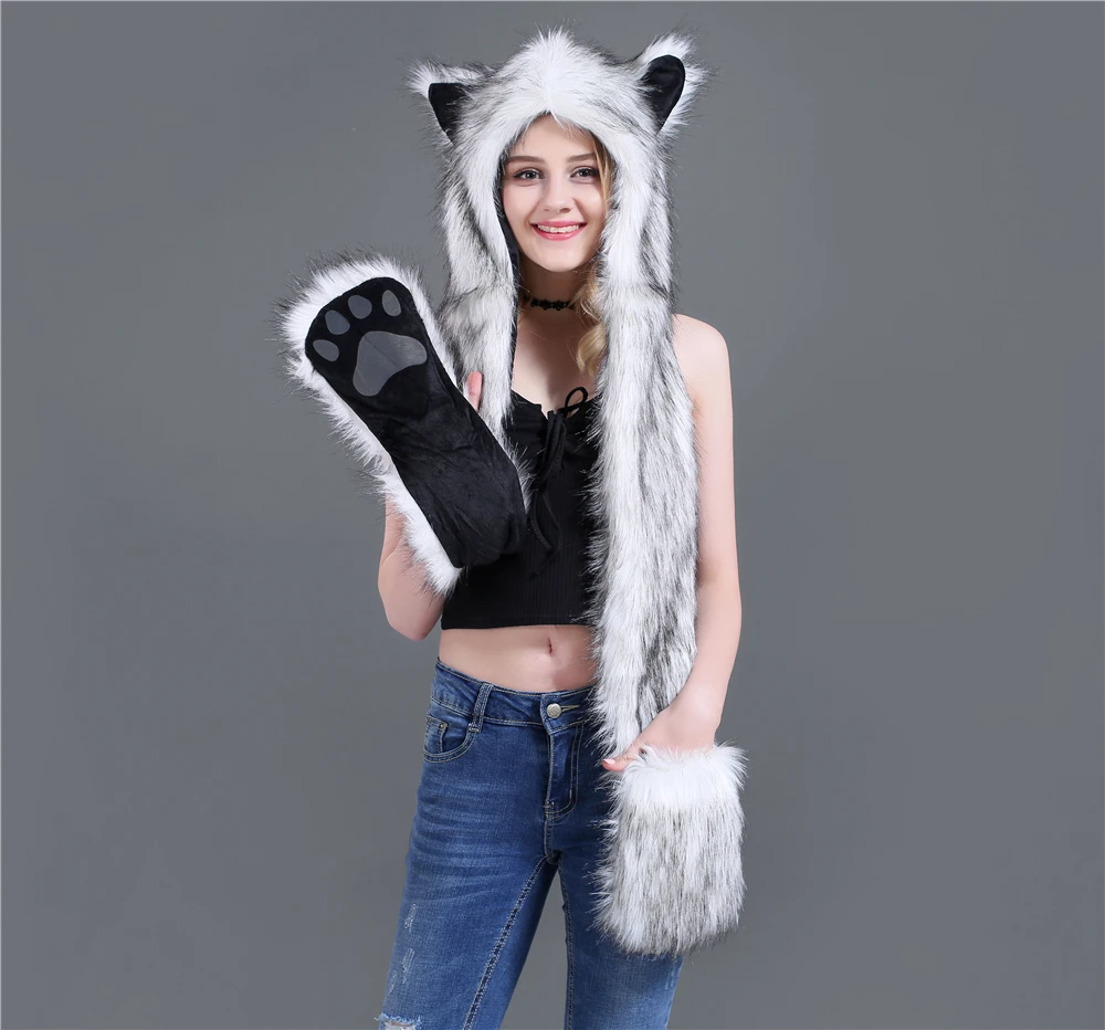 Special Offer Популярные женские теплые шарфы из искусственного меха для зимы Волк тигр Хаски шарф капюшон набор перчаток шапка для девушек Животные Дух ... Discount 25% Today!