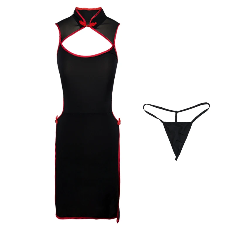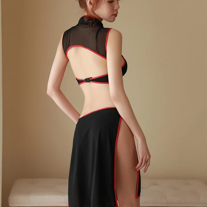 (44% Off) Купить Hoyyezen, новинка, сексуальная перспектива, открытая спина, китайский стиль, тонкие бедра, Cheongsam, раздельное, Черное и серебряное ночное белье, но... Цена Дешево