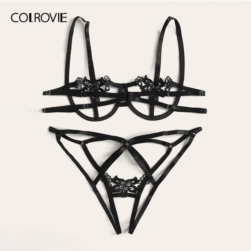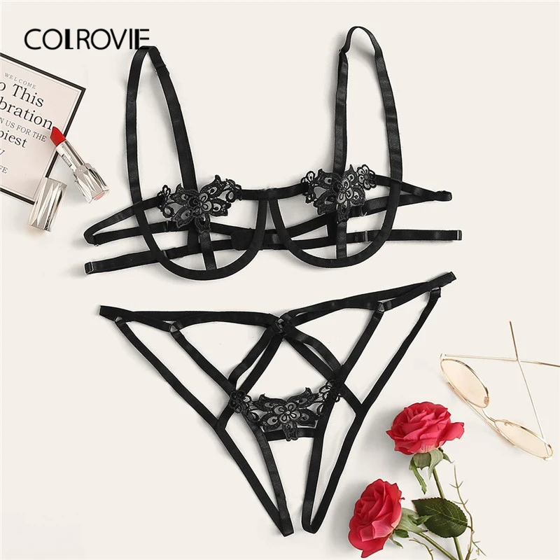 (47% Off) Купить COLROVIE, набор женского нижнего белья на косточках с вырезами, новинка 2019, одноцветные сексуальные комплекты, бюстгальтер и хипстеры, женский н... Продажа Дешево