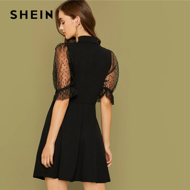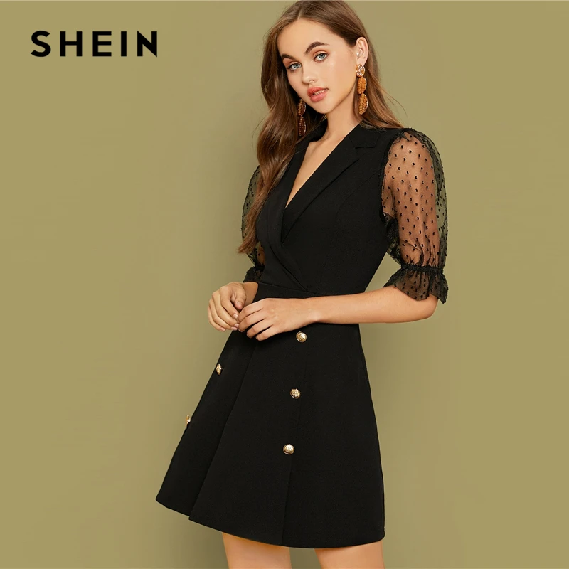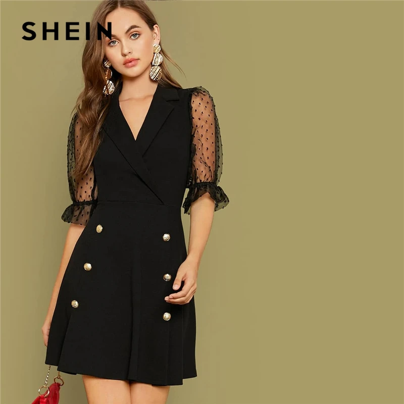 Special Offer Шеин черный вырез с двойными пуговицами спереди офисное платье для женщин 2019 осенние сетчатые рукава с v образным вырезом обёрточная бумага... Discount 48% Today!